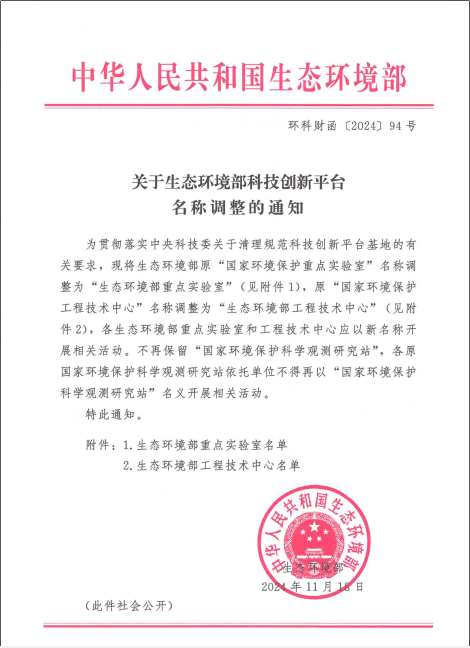 关于生态环境部科技创新平台名称调整的通知
